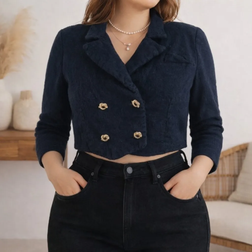 Casaqueto / casaco cropped azul vintage, com CGC, em lã batida de poliéster. Possui mangas 7/8, pequenas ombreiras e forro. General Modas / Veste M / Condição 8/10 45cm ombro, 95cm busto, 47cm manga e 40cm comprimento.