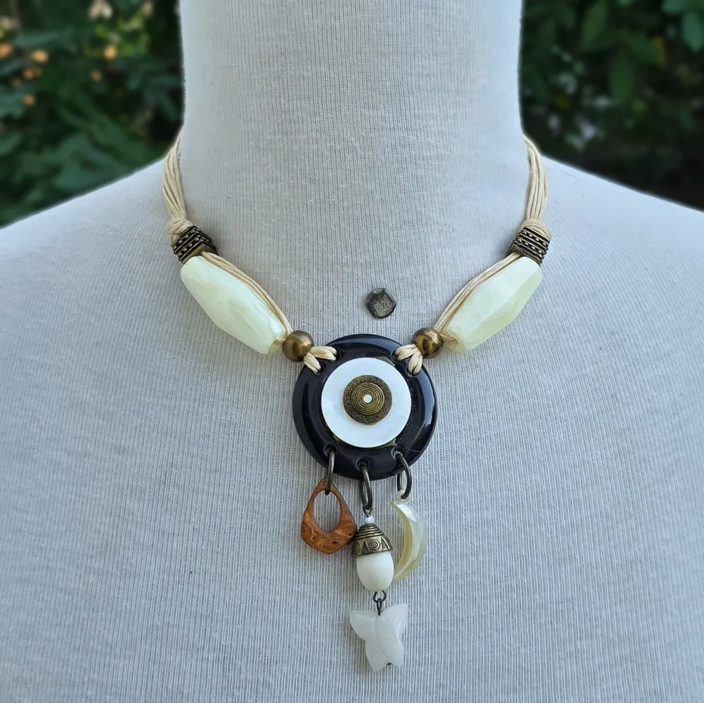 Colar Axelle Creation (França). Estilo boho-chic com mix de materiais: cordões de algodão, metais em ouro velho, resina marfim, madrepérola e pingente de madeira orgânica. Peça europeia autêntica, com design artesanal e acabamento refinado. Perfeito para compor looks casuais e elegantes.