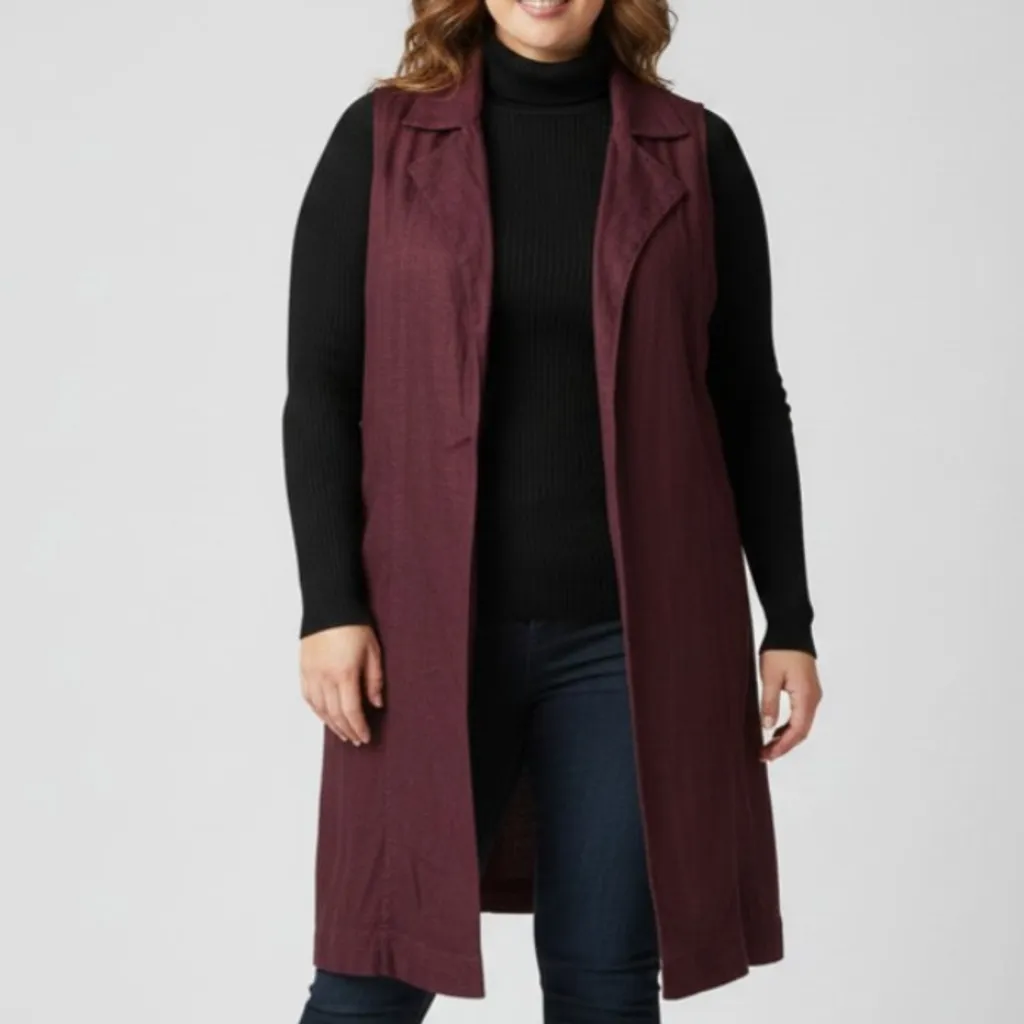 Colete de alfaiataria com linho na composição, na cor marsala, fivela de ajuste nas costas, tamanho GG, da marca de moda plus size Arimath. Largura: 110 cm Comprimento: 74 cm