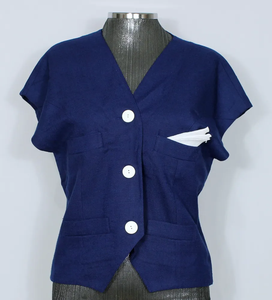 Cor: azul marinho e branco Tecido: algodão encorpado, lembra um linho Modelo: feminino Bolsos: sim Forro: não possui Vintage: sim, com CGC Peça em perfeitas condições e sem avarias. Veste P/M (favor verificar as medidas): Medidas: Ombros: 38 cm Busto (circunferência): 100 cm Cintura (circunferência): 96 cm Comprimento da manga: 13 cm Comprimento da peça: 58 cm