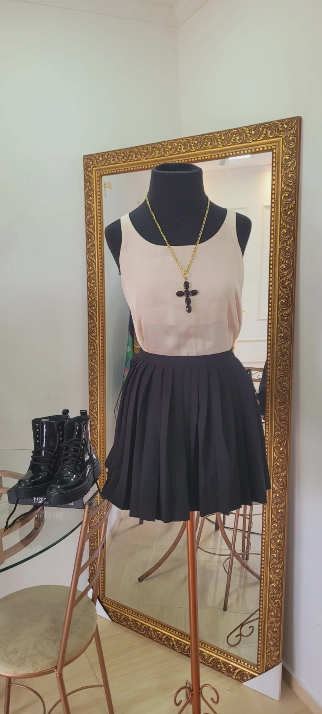 blusa regata acetinada na cor off-white, veste m/g. saia plissada preta da shein, forrada por baixo, veste m/g.