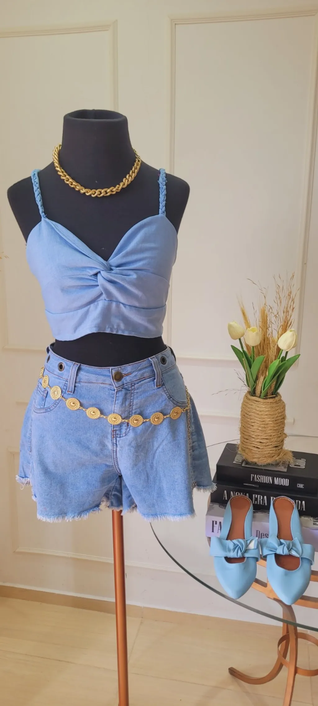Top super delicado veste M G com elástico nas costas 📌Shortinho Jeans fica lindo no corpo veste 40 42 📏 Medidas 90 cintura 100 quadril 37 comprimento #lookfemenino #modaverao #estilo #tendência