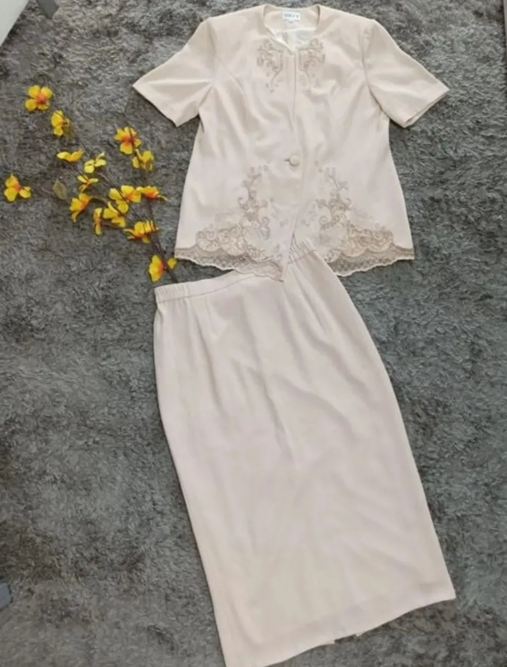 Conjunto feminino bege com bordados e forro interno. Blazer e saia. Em perfeito estado de conservação. Medidas blazer: busto: 108 cm mangas: 29 cm ombro: 43 cm comprimento: 73 cm. Saia: cintura com elástico: 86 cm quadril: 108 cm comprimento: 89 cm.