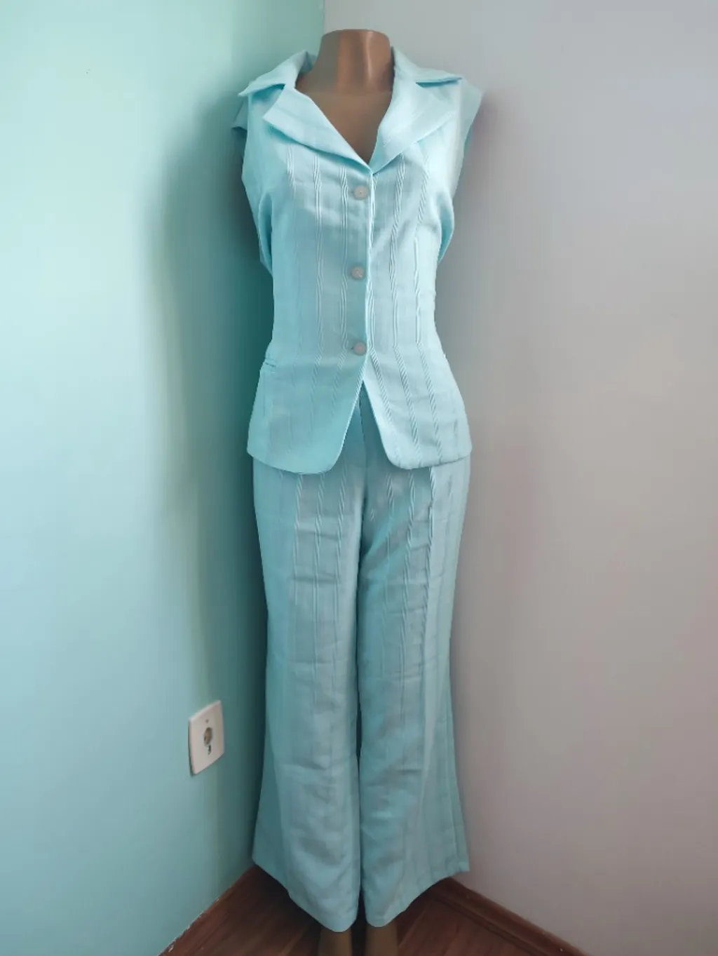 conjunto de blusa e calça na cor rosa claro, a blusa apresenta fechamento frontal por botões e forro, a calça reta possui shape reto que não marca a silhueta, cintura alta, fechamento frontal por zíper e botão, marca Silk lod