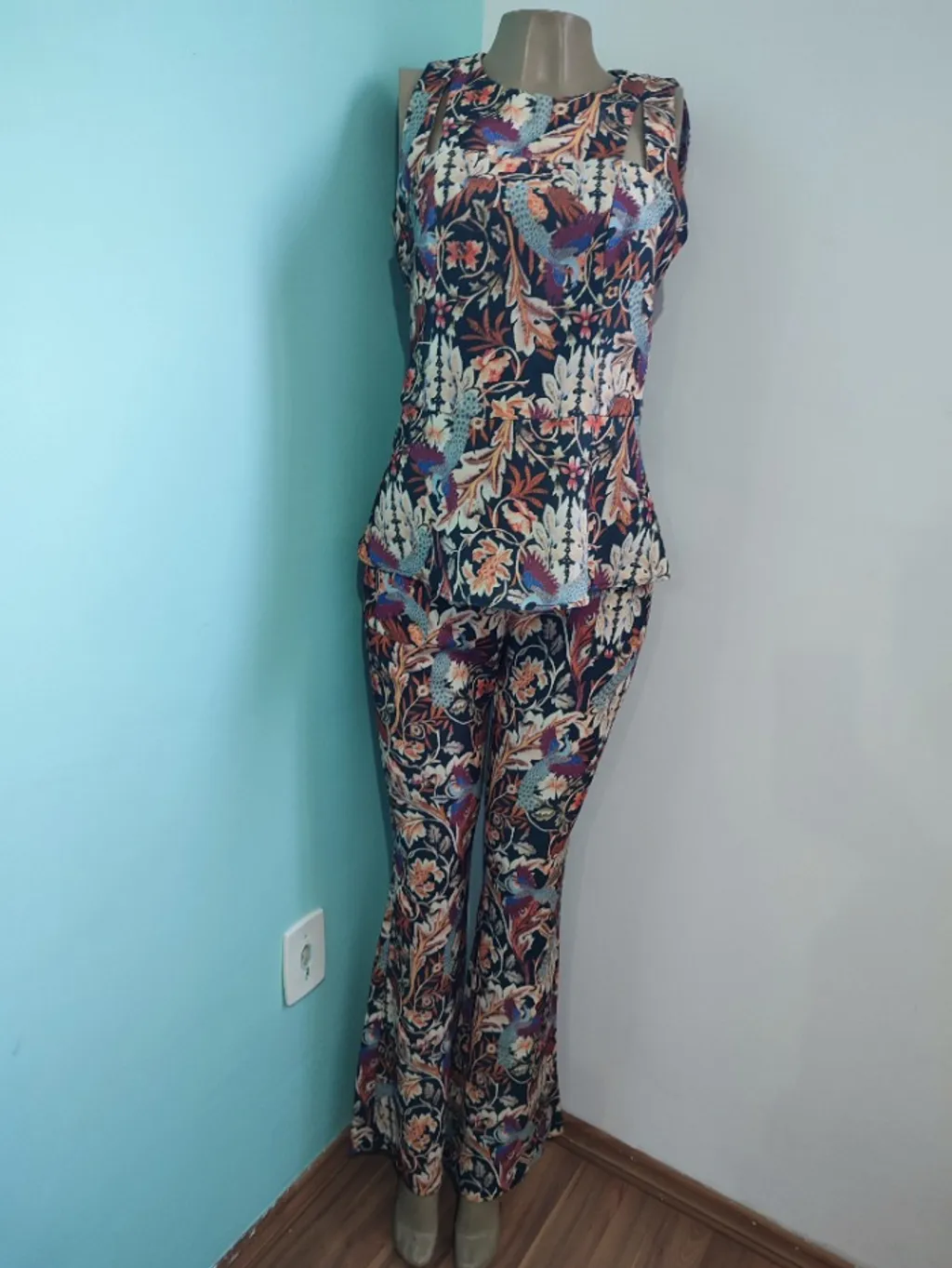 Blusa: Possui modelagem com recortes nos ombros e peplum na cintura, criando uma silhueta feminina. Calça: Estilo flare ou pantalona, com cintura alta, ideal para alongar a silhueta quando combinada com a blusa do mesmo padrão