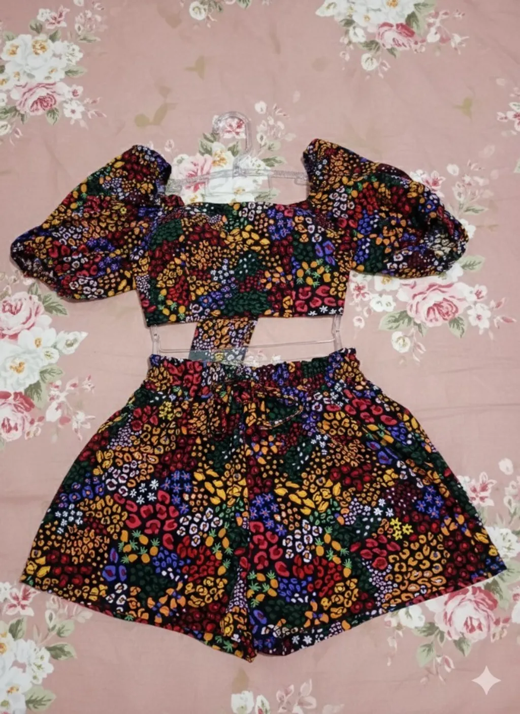 Conjunto novo, cropped com bojo e amarração atrás, tecido fresco poliéster, cós com elástico, manga fofa com elástico. blusa: cintura 76 cm, busto 86 cm. short soltinho: cintura até 88 cm, quadril até 105 cm (aproximadamente). Muito bonito!