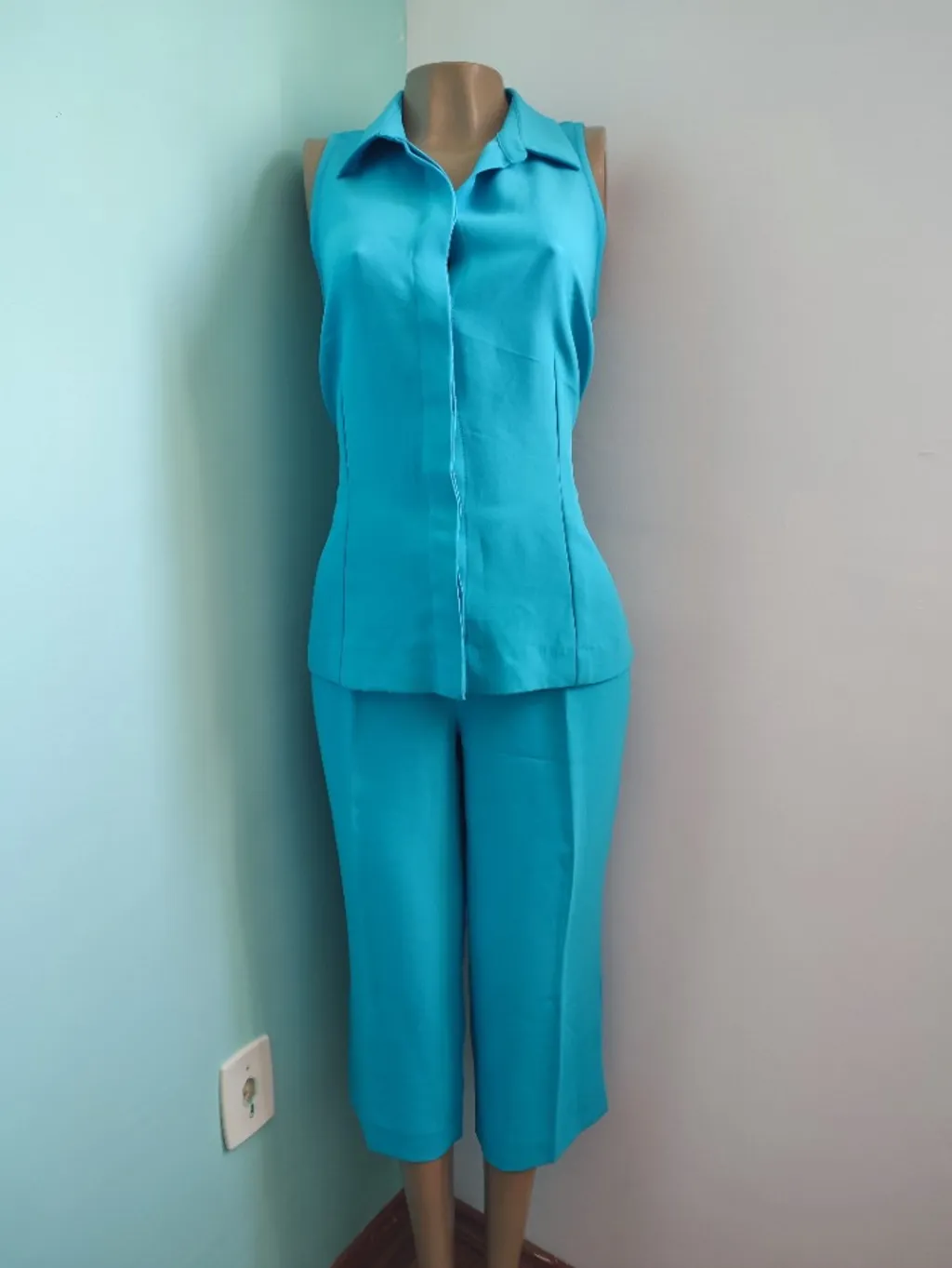 Este conjunto de duas peças em azul turquesa é uma opção elegante de alfaiataria, composta por um colete sem mangas com gola e botões frontais, acompanhado de calças de corte reto, tamanho M