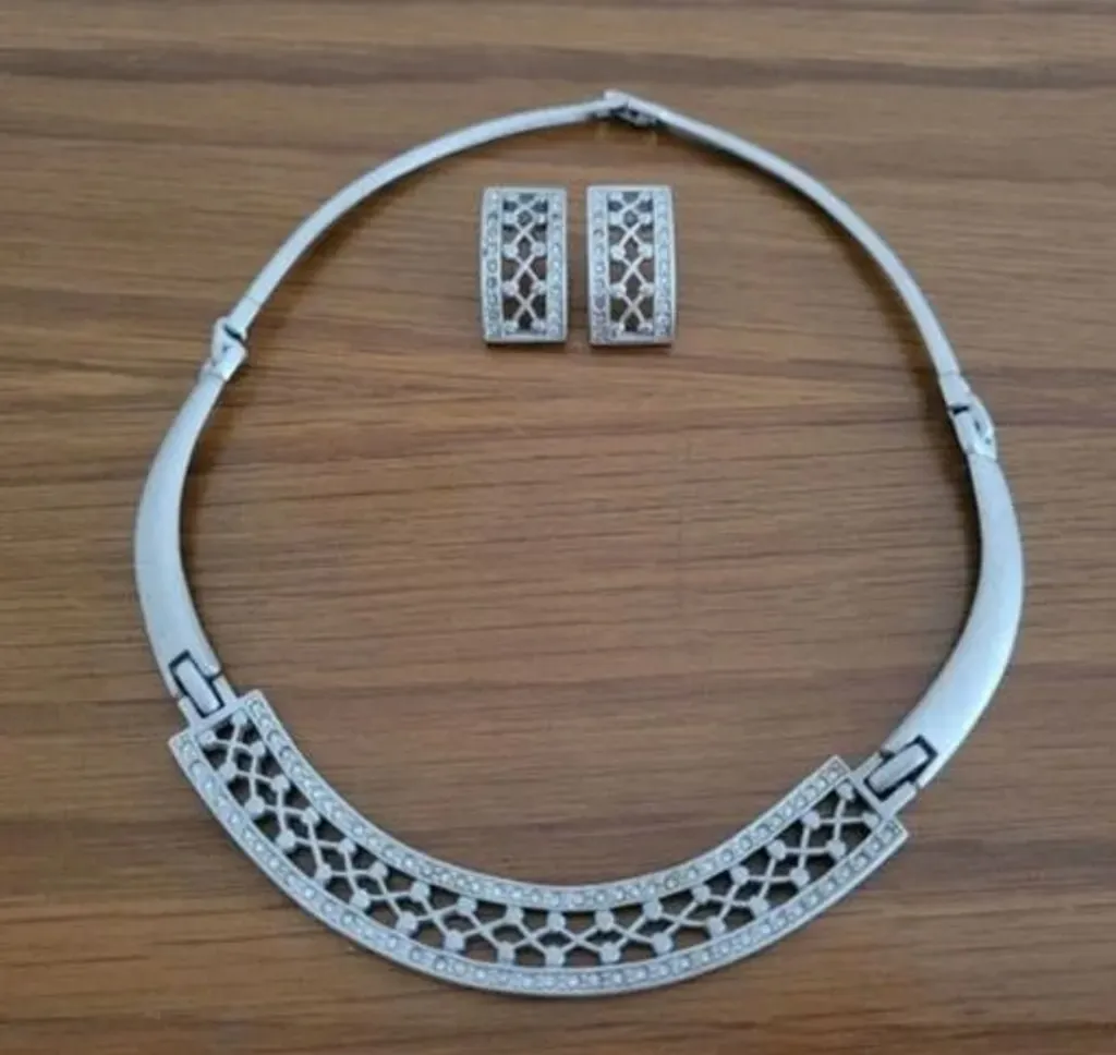 lindo conjunto royale composto por um colar choker estruturado e brincos articulados, este conjunto foi desenhado para a mulher que não abre mão da sofisticação e deseja brilhar em eventos especiais, casamentos ou jantares de gala. tamanho: 12 cm de extensão( colar) + 4,5 cm de comprimento ( brinco). envio: somente às sextas-feiras.