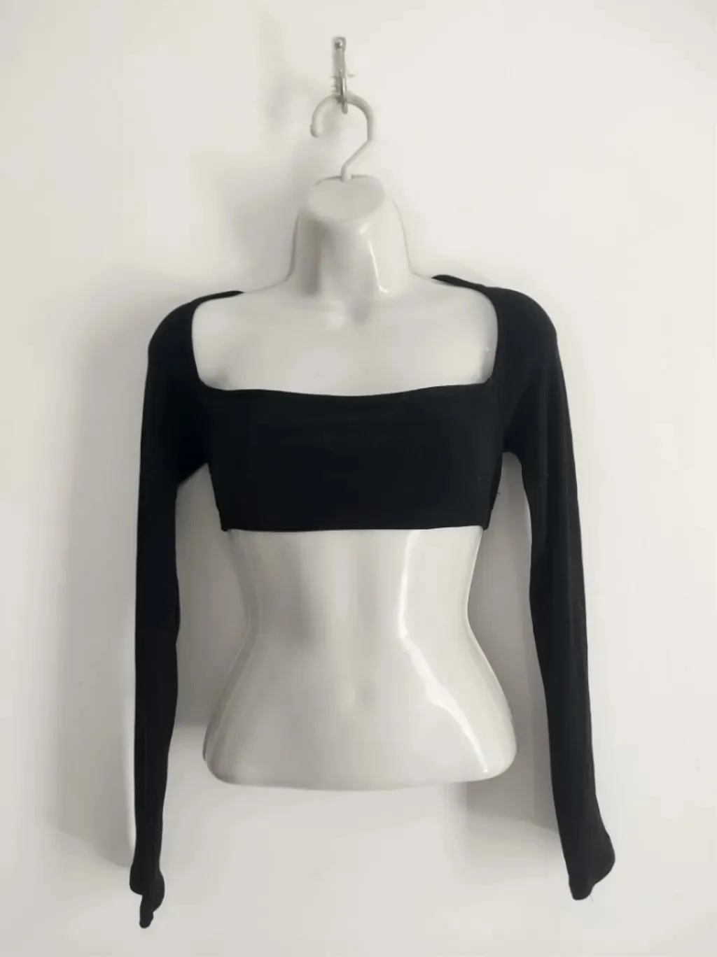 CONFIRA AS MEDIDAS ABAIXO: Todo canelado, possui gola quadrada, manga longa e decote nas costas com amarração. Usado, porém em excelente estado de conservação. Tamanho: M na etiqueta, mas veste P Cor: Preto Tecido: Poliéster Marca: Shein Condição da peça: 10/10 Medidas: Busto: 80cm estica até 90cm Abaixo do busto: 70cm estica até 80cm Comprimento: 23cm