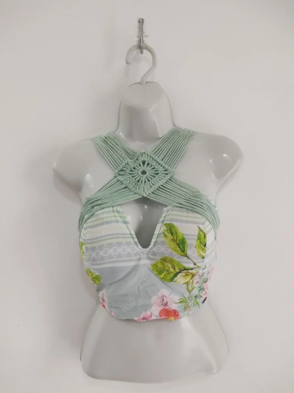 CONFIRA AS MEDIDAS ABAIXO: Possui bojo, decote com trama cruzada na frente, recorte vazado no busto, fechamento com botão e amarração nas costas. Usado, porém em excelente estado de conservação. Tamanho: M Tecido: Viscose Marca: M Belle Condição da peça: 10/10 Medidas aproximadas: Busto: 96cm Abaixo do busto: 80cm Comprimento: 41cm