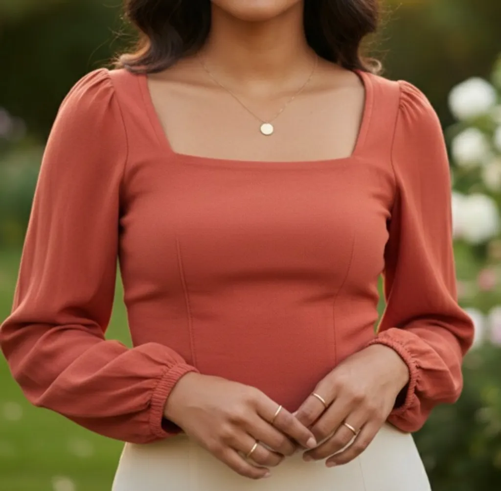 Cropped terracota de tecido estruturado e plano (parece algodão/viscose) feito por modista. Estilo princesa com ombros e punhos drapeados. Forro na parte central. Não possui zíper, atenção medidas! Sem etiquetas / Veste XPP / Condição 9/10 78cm busto, 62cm cintura, 59cm manga 45cm comprimento.