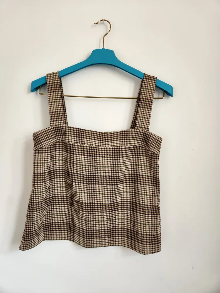 Cropped em tecido encorpado com padronagem houndstooth (pied-de-poule) nos tons marrom, caramelo e preto, com alças largas e decote reto. Excelente Estado