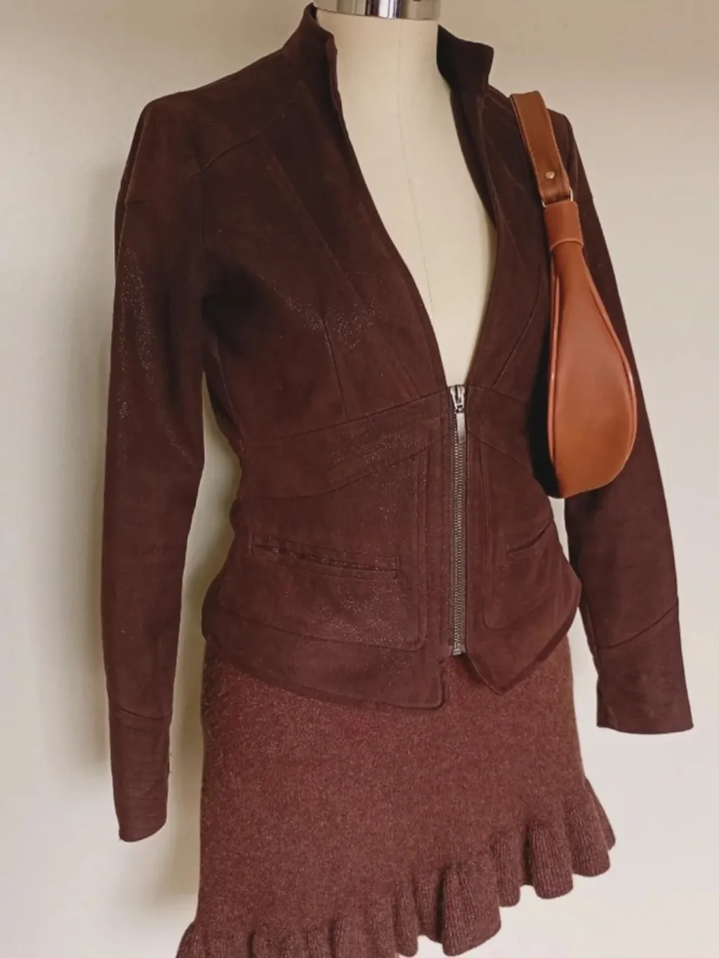 jaqueta feminina marrom em camurça com partículas de brilho