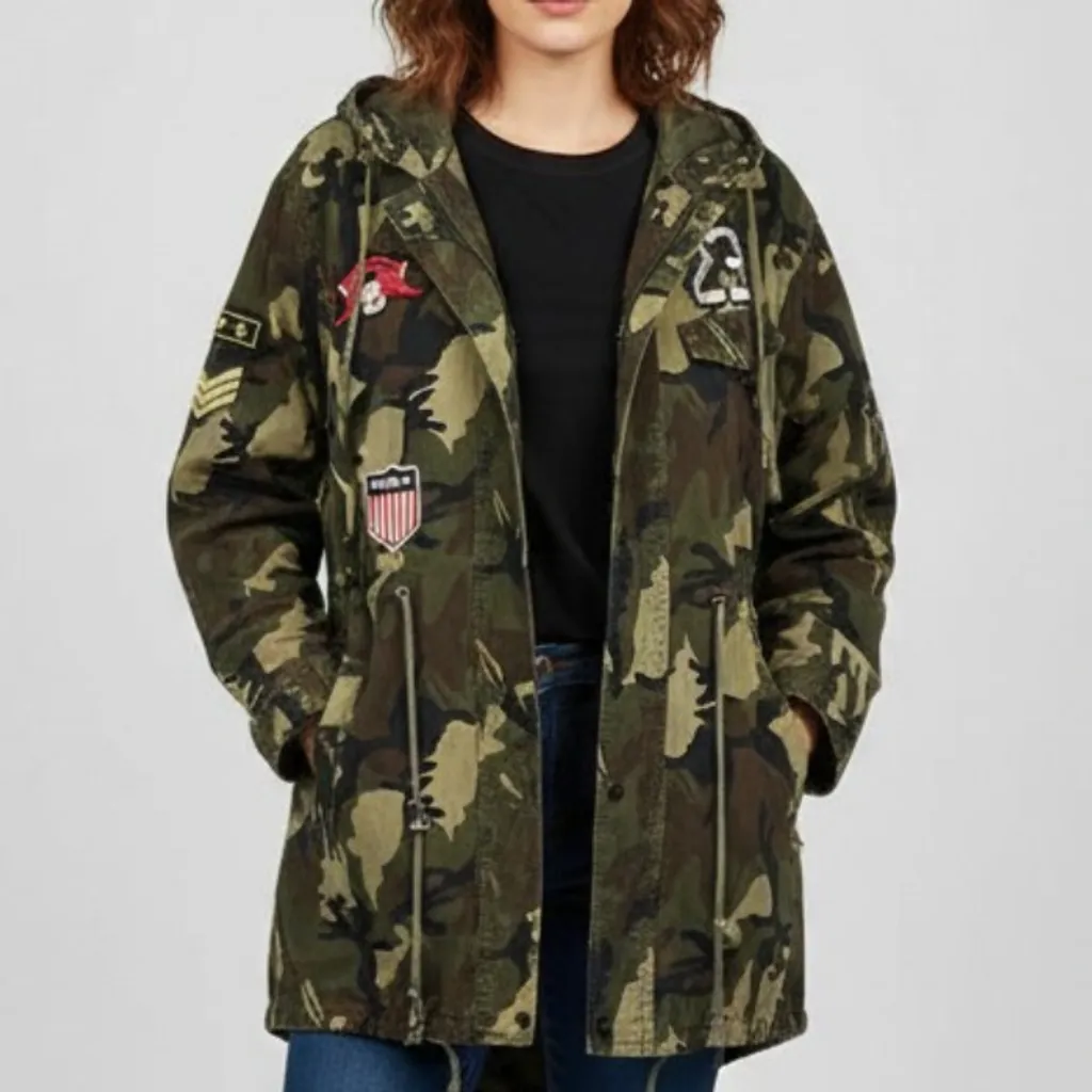 Jaqueta parka camuflada com bordados aplicados, modelo alongado, com cordão na cintura, forrado e bem quentinho, varios bolsos, fechamento de zíper e botões de pressão, tamanho GG. Busto: 116 cm Cintura: 119 cm Comprimento: 75 cm