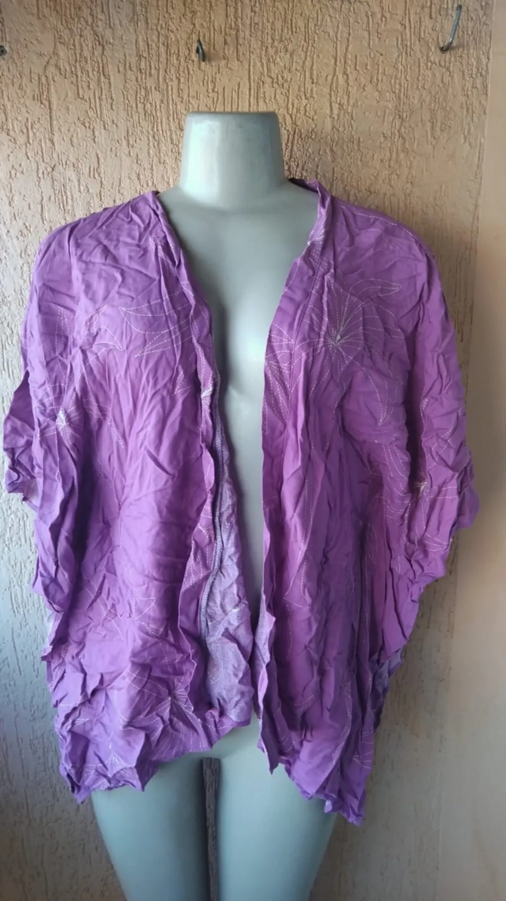 Eleve o seu visual com este Kimono Lilás, uma peça versátil que une delicadeza e conforto. Com uma modelagem bem larguinha e caimento fluido, ele é perfeito para sobreposições casuais ou para dar um toque "boho chic" ao look do dia a dia. A peça apresenta um tom lilás suave com detalhes em bordados lineares (ponto corrido) que formam desenhos delicados, trazendo uma textura única e artesanal ao tecido. Destaques do produto: Estado: Produto Novo (nunca usado). Cor: Lilás/Lavanda. Tamanho: G (Veste confo