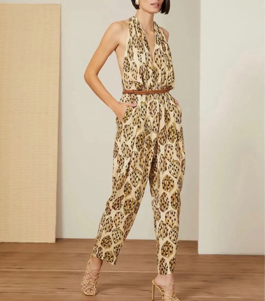 macacão midi com decote cruzado e amarração no pescoço, costas a mostra, mix de estampas e comprimento midi. passante no cos para cinto. tamanho: 36 condição: perfeito estado, porém está sem o cinto.