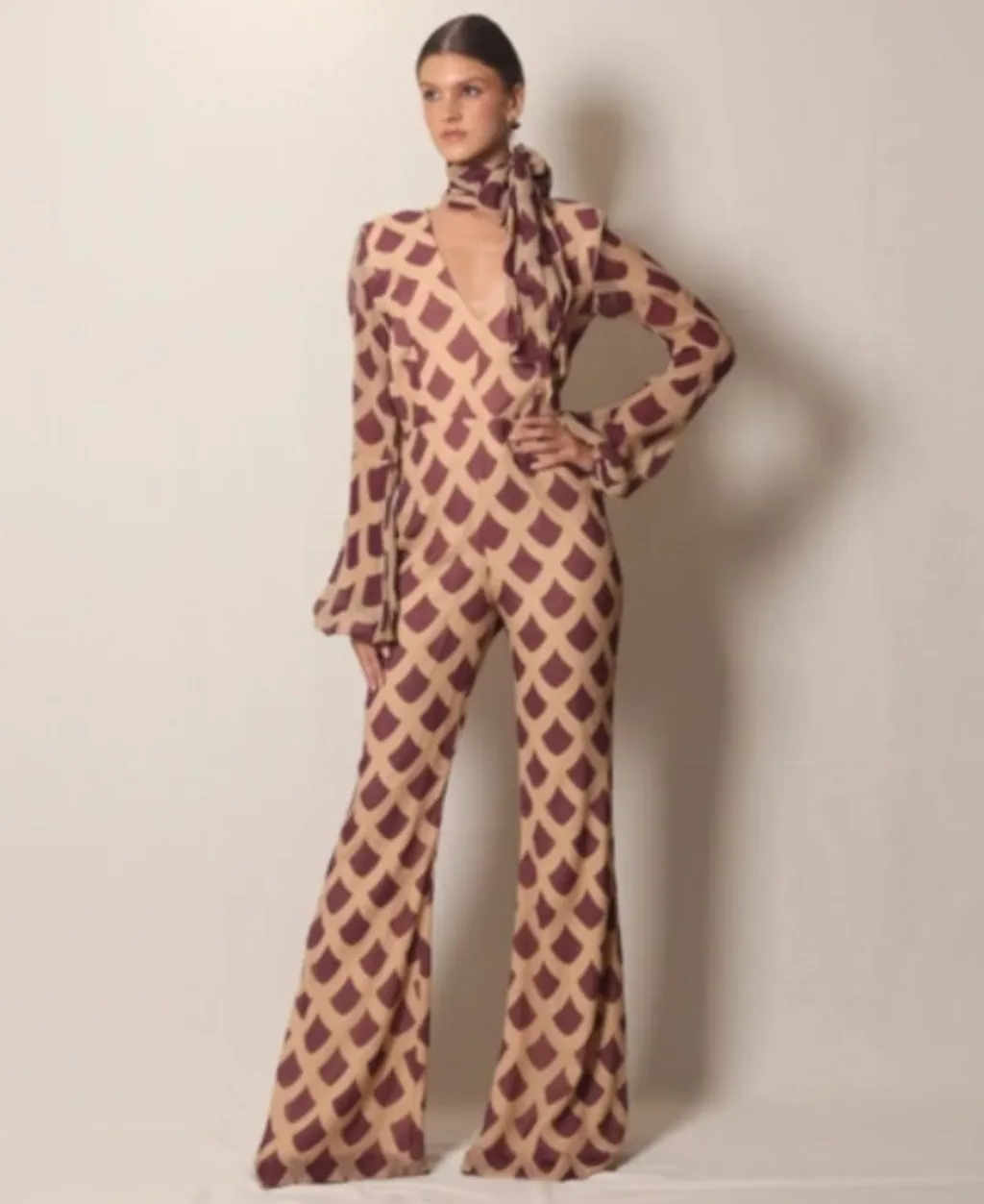 Macacão Fabulous Agilitá, com estampa sofisticada, mangas longas e detalhe de laço no pescoço, que traz elegância e personalidade ao look. a modelagem alonga a silhueta e garante caimento impecável. ideal para eventos diurnos e noturnos, almoços elegantes, exposições, jantares, viagens, resorts e ocasiões especiais.