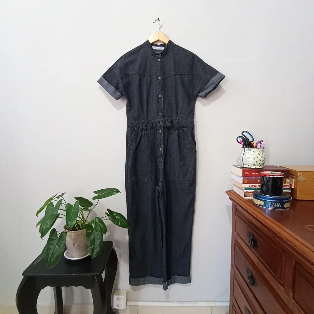 Macacão jeans amaro, tamanho 36, possui gola padre, mangas curtas dobradas, fechamento frontal por botões e cintura marcada. modelagem reta e confortável. largura 44cm, comprimento 137cm.