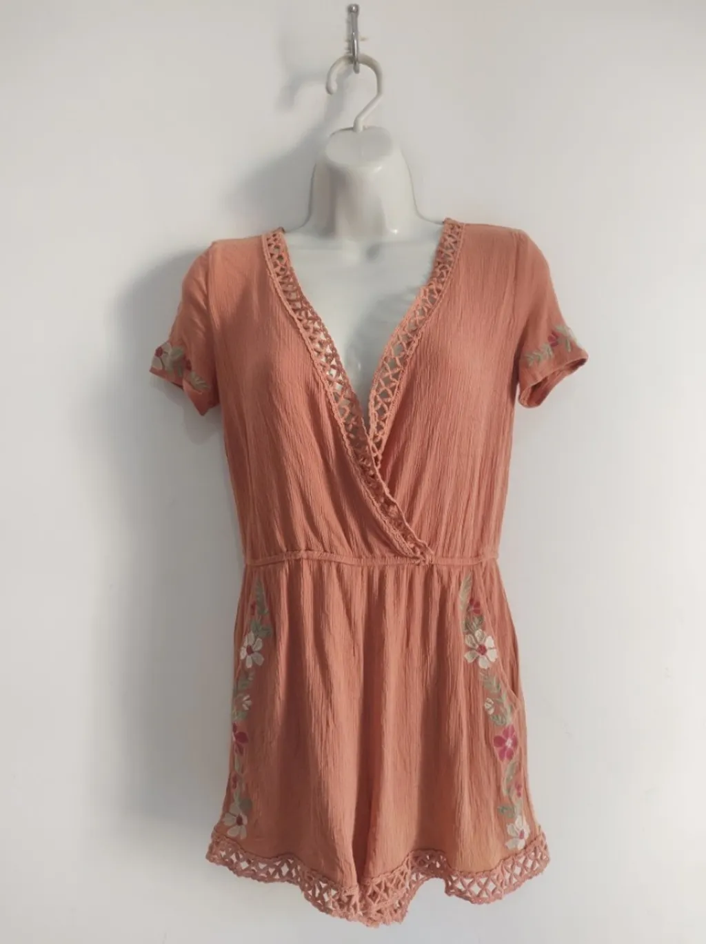 CONFIRA AS MEDIDAS ABAIXO: Posui gola v, manga curta, elástico na cintura, bordado floral nas mangas e bolsos e renda guipir na gola e barra. Usado, porém em excelente estado de conservação. Tamanho: P Cor: Marrom claro Tecido: Algodão Marca: Forever 21 Condição da peça: 10/10 Medidas: Busto: 94cm Cintura: 66cm estica até 80cm Quadril: 96cm Comprimento: 70cm Gancho: 30cm