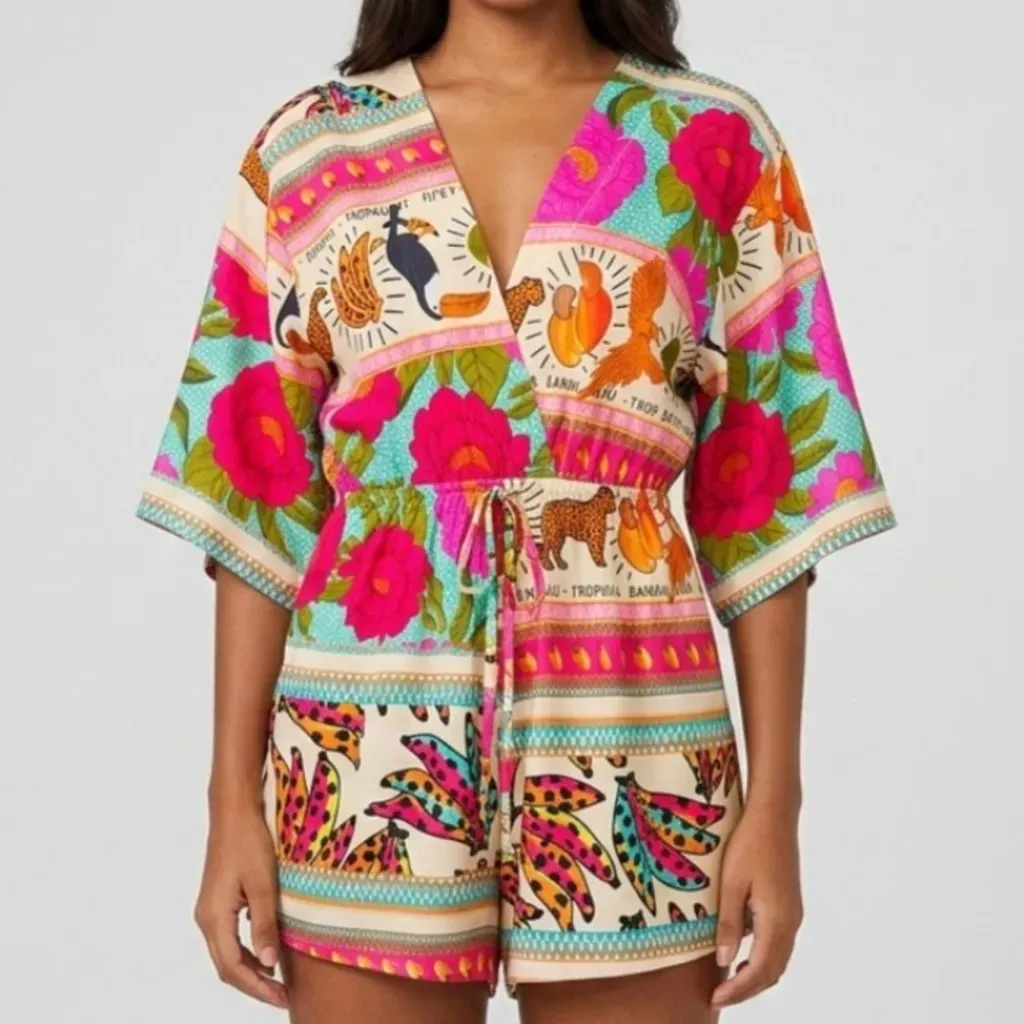 Macaquinho estilo tropical com estampa de tucanos e flores, decote em V profundo, tamanho único que veste M/G, com ajuste nas costas, sem uso. Busto: 100 cm Cintura: 76 cm Quadril: 124 cm Comprimento: 80 cm