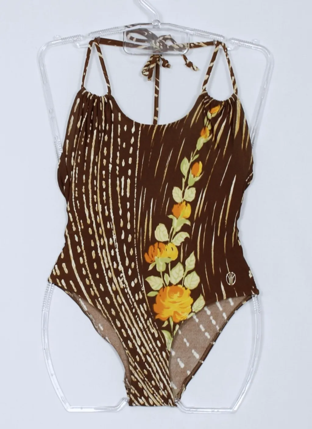 Maiô em tons de marrom e estampa floral colorida Tecido: lycra, estica e se adapta ao corpo Possui ajuste na alça para melhor encaixe. Está em bom estado de conservação. Tamanho 40 vintage, é pequeno, veste PP/P Altura: 68 cm (pode ser aumentado ou diminuido pela amarração)