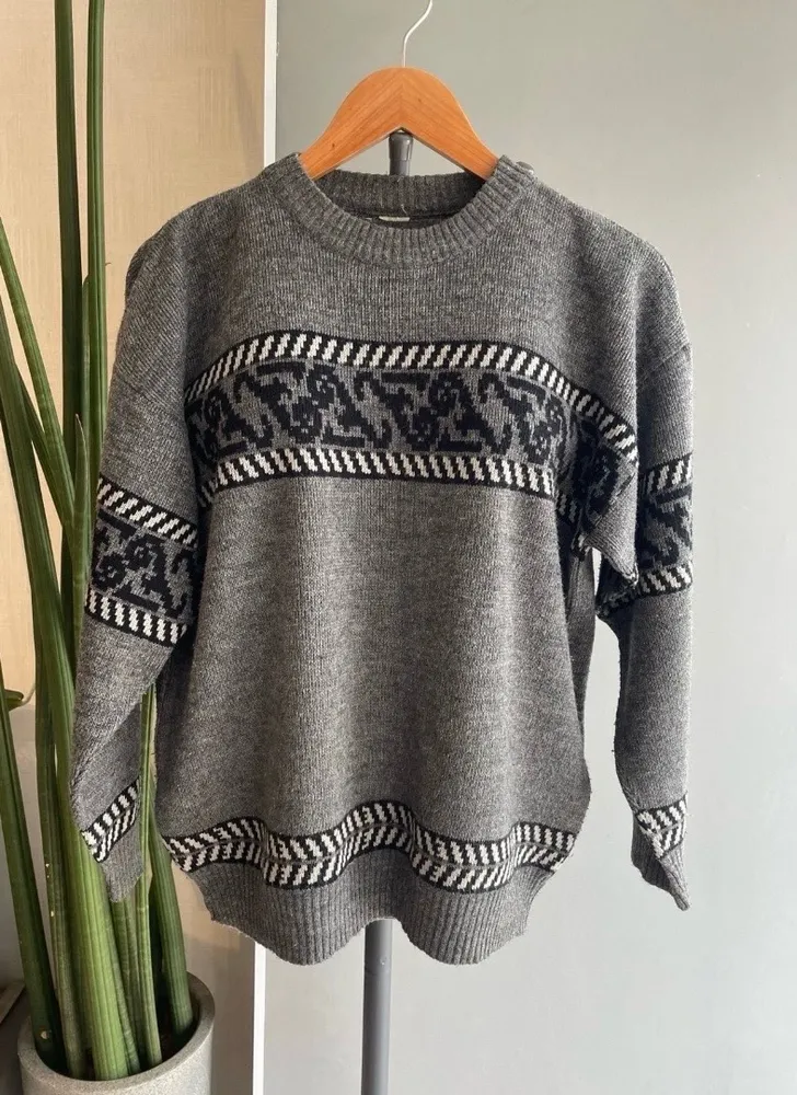 do produto malha de lã, goa redonda, cinza, manga longa. medidas - ombro a ombro 55, busto 110 de circunferência, manga 49, comprimento 63