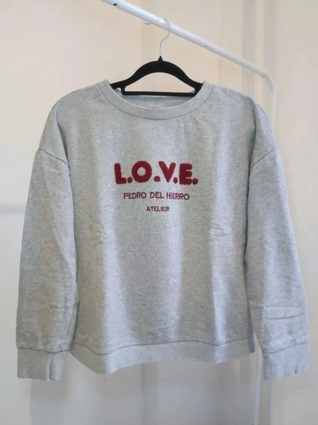 moletom cinza mezcla com bordado l.o.v.e., tamanho pp grande, da marca pedro del hierro (marca espanhola com roupas excelentes) 110 cm de peito e cintura 54 cm de comprimento