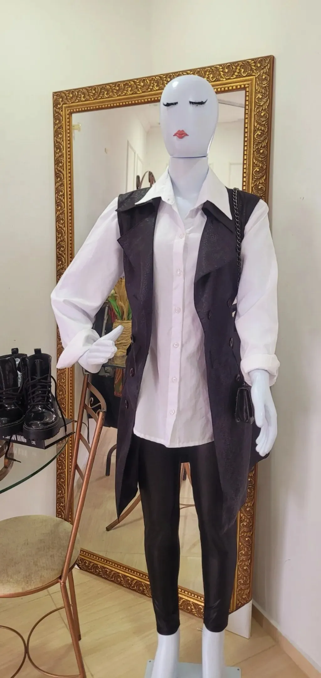 🤌Essa peça é super versátil e estilosa — um verdadeiro curinga no guarda-roupa 👌 Veste do P ao G devido a regulagem 📌Modelo híbrido: funciona tanto como colete alongado quanto como vestido 📌Material: parece couro sintético (resinado) — dá esse brilho elegante e moderno 📌Fechamento: botões frontais duplos (estilo trench coat) 📌Corte: acinturado, valoriza a silhueta 📌Comprimento: médio/alongado, podendo ser usado aberto ou fechado ✨ Como usar (3 formas incríveis) 1. Como vestido (mais elega