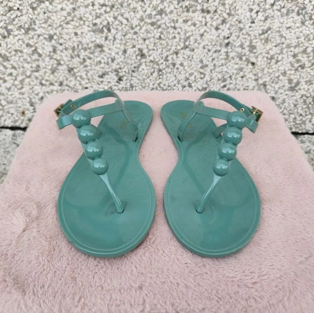 Rasteirinha Arezzo na cor verde, tamanho 38. Possui tiras finas com detalhes de bolinhas e fechamento com fivela no tornozelo. *Tem pequenas manchinhas na parte interna, conforme fotos.