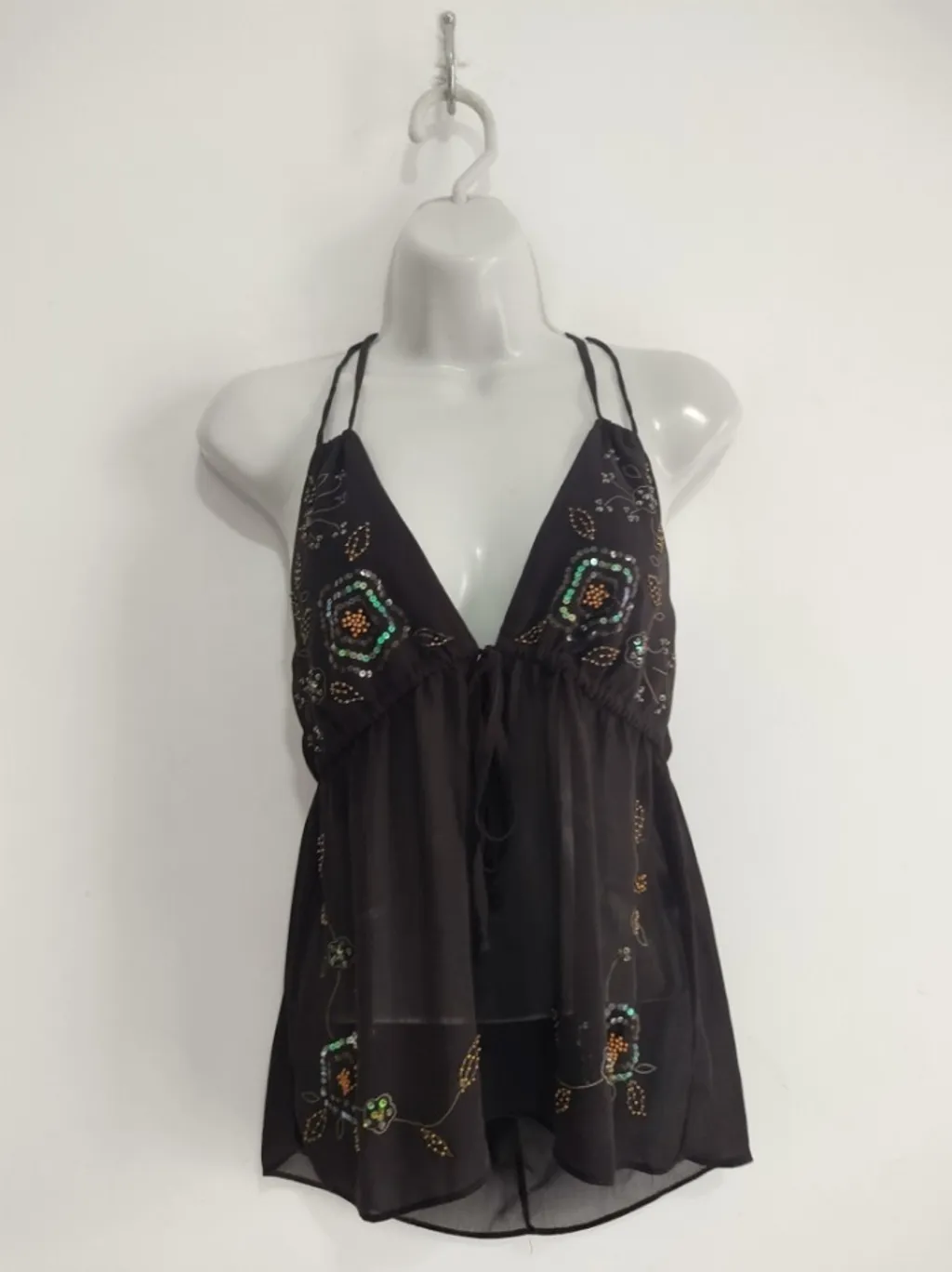 CONFIRA AS MEDIDAS ABAIXO: Possui amarração com alça dupla no pescoço, decote v com amarração, bordados em paetês, elástico nas costas e transparência na parte debaixo. Usada, porém em excelente estado de conservação. Tamanho: N Cor: Marrom Tecido: Poliéster Marca: Kher Condição da peça: 10/10 Medidas aproximadas: Busto: 90cm Cintura: 80cm Comprimento: 60cm
