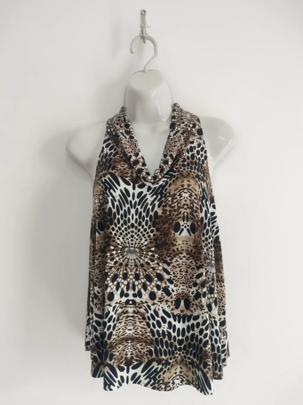 CONFIRA AS MEDIDAS ABAIXO: Possui gola boba, decote nas costas com detalhe de argola prateada e estampa de oncinha. Usada, porém em excelente estado de conservação. Tamanho: M Cor: Marrom e branco Tecido: Poliéster (liganete) Condição da peça: 10/10 Medidas: Busto: 88cm estica até 98cm Cintura: 106cm Comprimento: 57cm