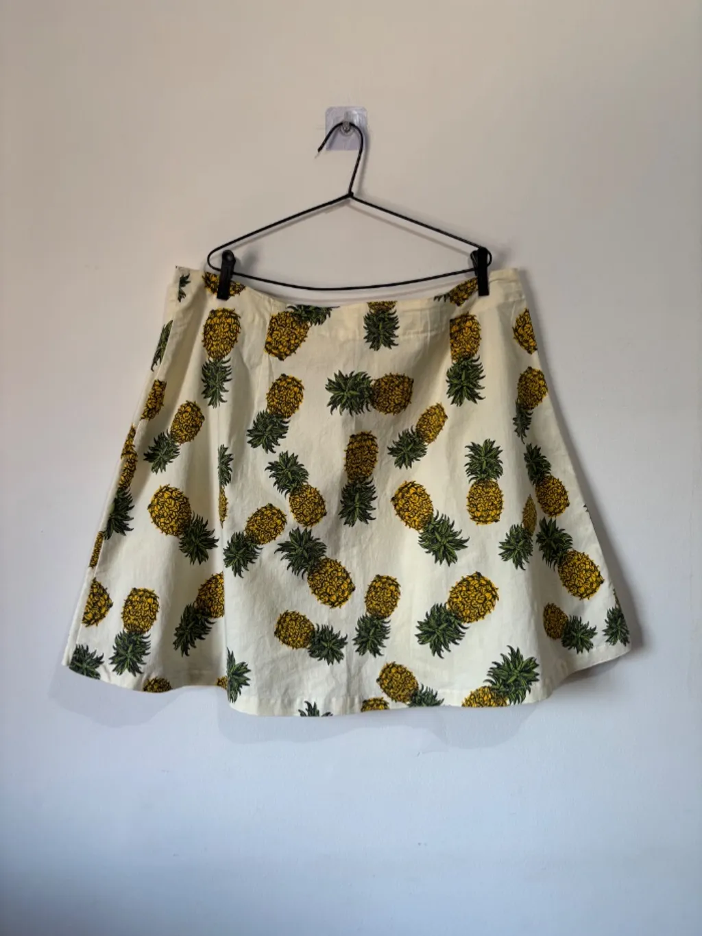 Saia bege/off, com estampas de abacaxi. A modelagem dela é mais rodadinha, ela não tem forro e tem um pequeno zíper para abertura/fechamento na parte de trás. Tamanho GG Medidas cós/cintura: 106 cm (circunferência) Comprimento: 56 cm