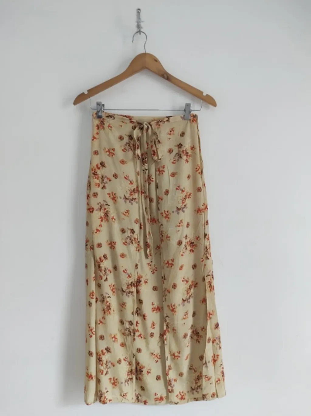 CONFIRA AS MEDIDAS ABAIXO: Possui cintura alta, fechamento com botão na lateral e amarração frontal. Usada, porém em excelente estado de conservação. Tamanho: P Cor: Amarelo estampado Tecido: Seda Marca: Chocolate Condição da peça: 10/10 Medidas: Cintura: 64cm Quadril: 110cm Comprimento: 90cm