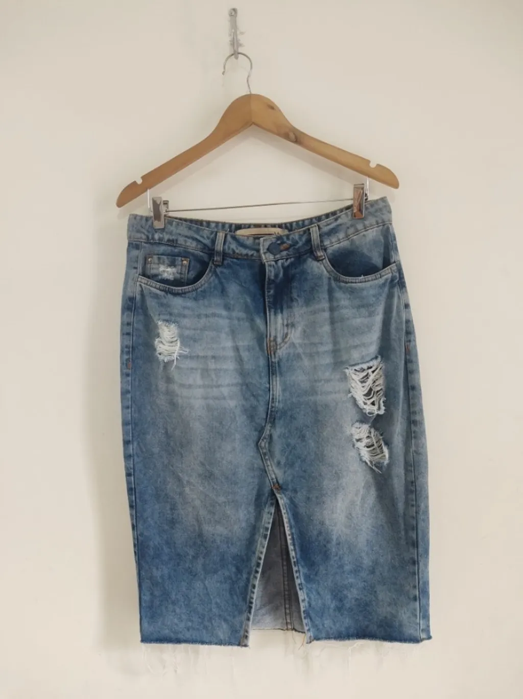 CONFIRA AS MEDIDAS ABAIXO: Possui cintura alta, fechamento com zíper e botão, bolsos funcionais, fenda frontal e detalhes destroyed. Usada, porém em excelente estado de conservação. Tamanho: 42 Tecido: Denim Marca: Vizzy Condição da peça: 10/10 Medidas: Cintura: 84cm Quadril: 108cm Comprimento: 65cm