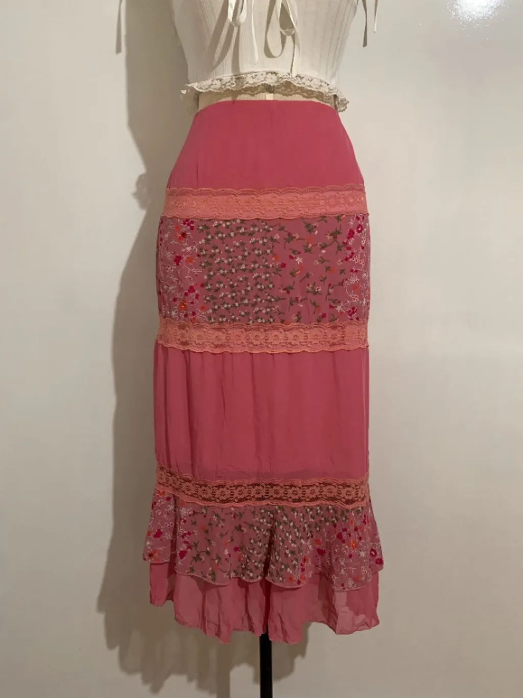 Tamanho: GG Medidas aproximadas: ♡ cintura: 80cm até 110cm ♡ quadril: 122cm ♡ comprimento: 78cm ♡ comprimento do forro: 52cm ⁃ a saia está ajustada ao manequim - possui forro, mas o forro não é do mesmo comprimento que a saia ⁃ possui um buraquinho próximo ao elástico da cintura (foto no anúncio) ⁃ 100% poliéster