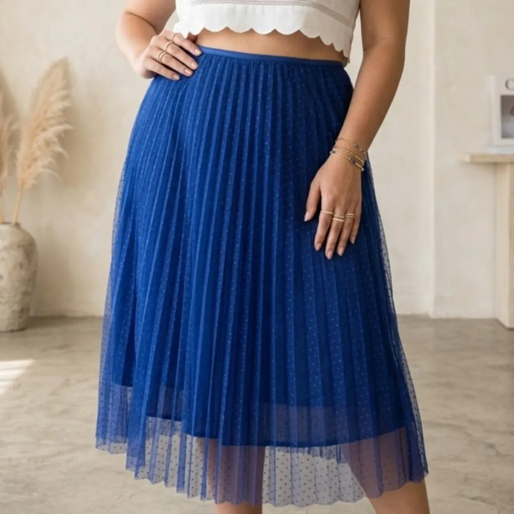Saia midi azul royal em tule com bordado mini poá plissado, possui forro e zíper invisível traseiro. 100% poliéster. Caos / Veste 42/ Condição 9/10: um fio puxado, última foto. 76cm cintura, quadril veste bem até 118cm e 71cm comprimento. fairycore cottagecore boho hippie festival