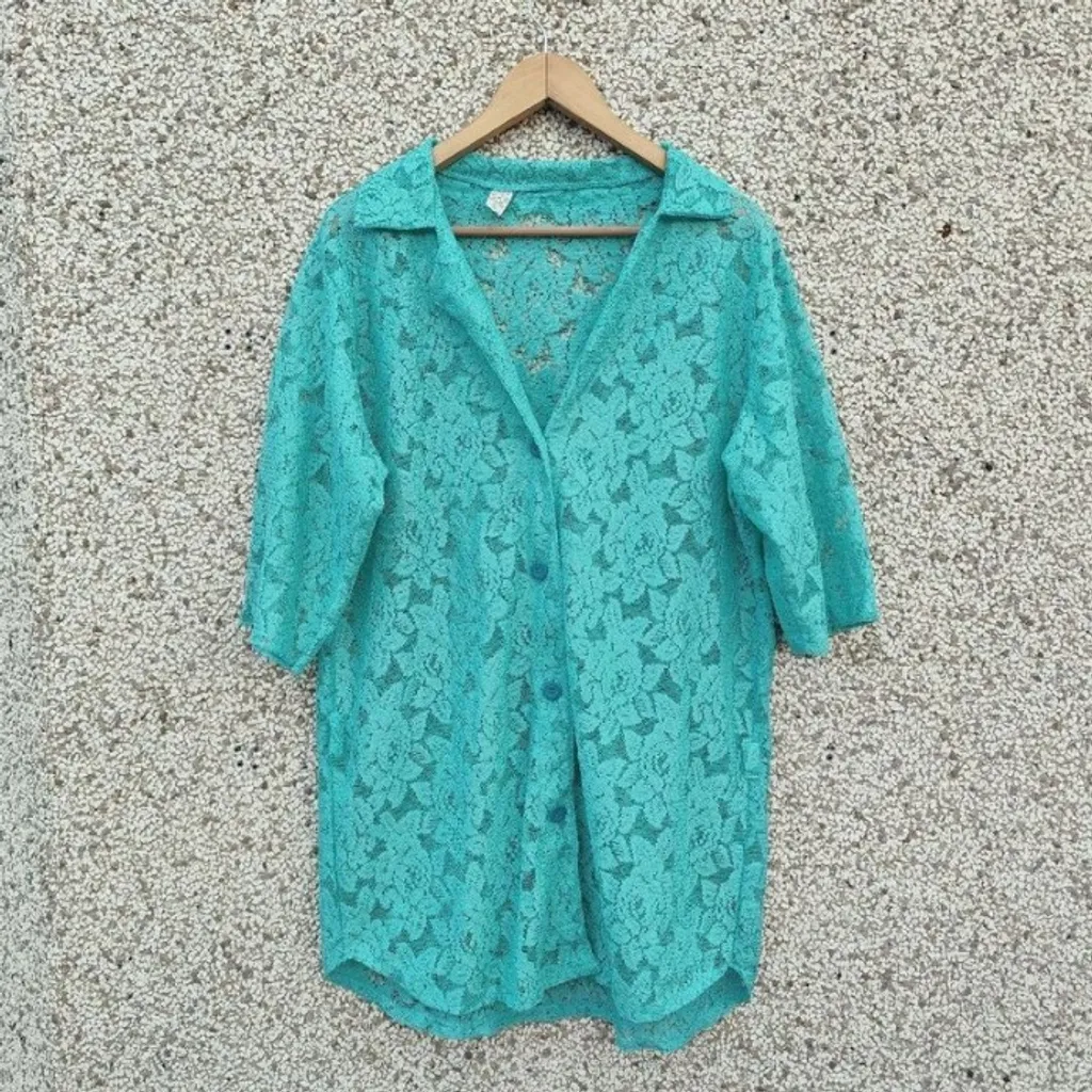 Saída de praia em renda, cor verde, com mangas 3/4 e fechamento com botões. Marca Art Praia, tamanho G. Medidas: 118cm busto / 110cm cintura / 116cm quadril / 82cm comprimento.