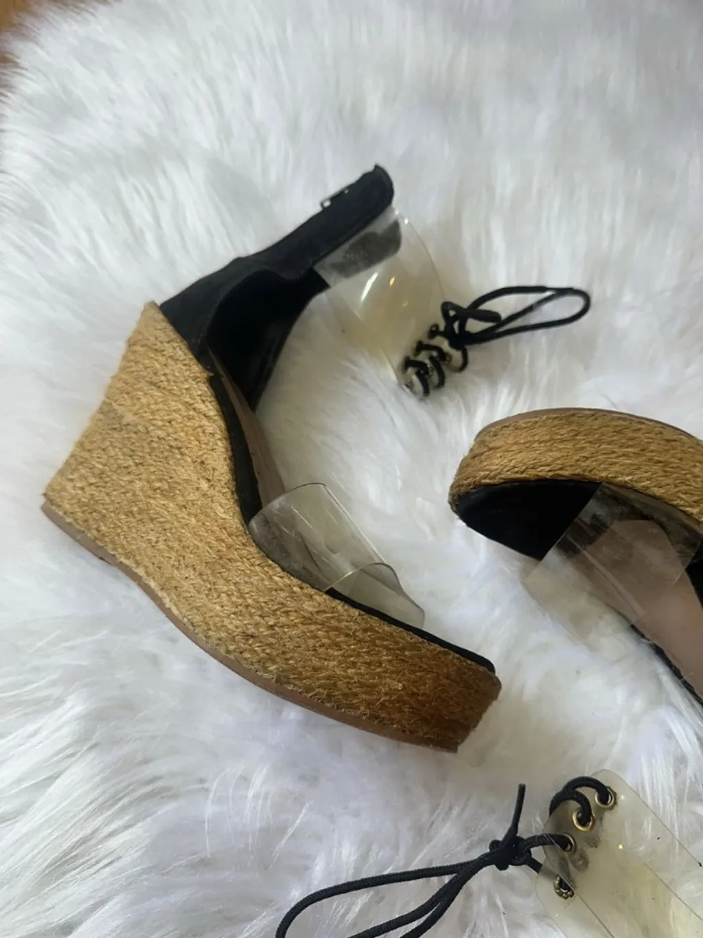 ✨ Sandália anabela preta com vinil transparente e salto em juta — estilosa e perfeita para o verão ☀️ 📏 Tam. 35 💖 Usada, bom estado