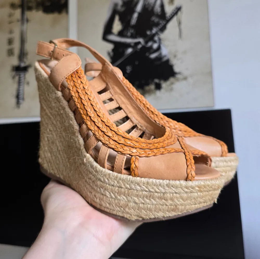 Sandália plataforma marrom em couro com detalhes de sisal. Arezzo, tamanho 34. Salto 12cm. Possui leve desgaste na sola e palmilha, conforme fotos.