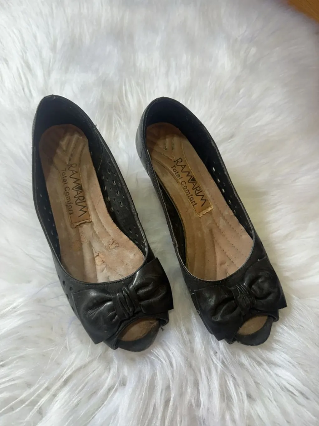 ✨ Sapato Ramarim preto da linha Total Comfort, com salto baixo, peep toe e detalhe de laço — elegante e super confortável. 📏 Tam. 35 💖 Usado, em bom estado
