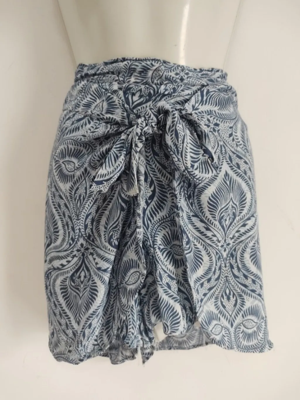 CONFIRA AS MEDIDAS ABAIXO: Possui cintura alta, estampa paisley, forro e amarração frontal e traseira na cintura. Usado, porém em excelente estado de conservação. Tamanho: M Cor: Azul e Branco Tecido: Poliéster e elastano Marca: Pérola negra Condição da peça: 10/10 Medidas aproximadas: Cintura: 80cm Quadril: 104cm Comprimento: 38cm Gancho: 35cm
