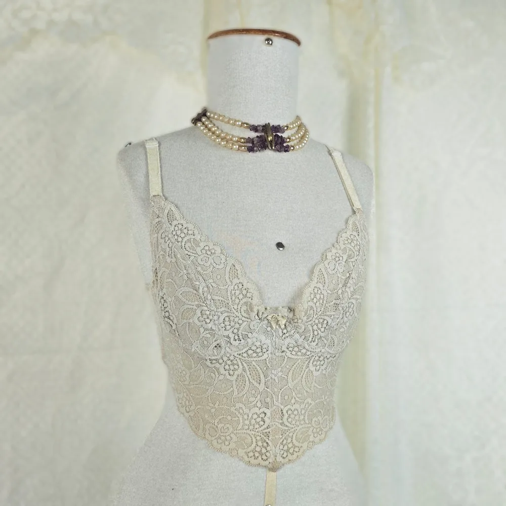 Sutiã estruturado estilo corpete Triumph Carina Vintage (CGC). Renda floral off-white de alta sustentação, com aro e sem bojo. Possui barbatanas. Peça rara dos anos 90. 44 na etiqueta mas veste PP (manequim das fotos é 38 e ficou levemente apertado). 65-72cm sob o busto.