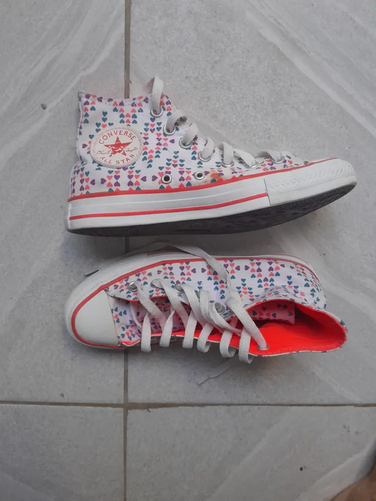 tênis converse all star cano alto branco, estampado com mini corações coloridos em tons de rosa, roxo e azul. o detalhe interno é em laranja neon vibrante. relíquia para as amantes de all star.