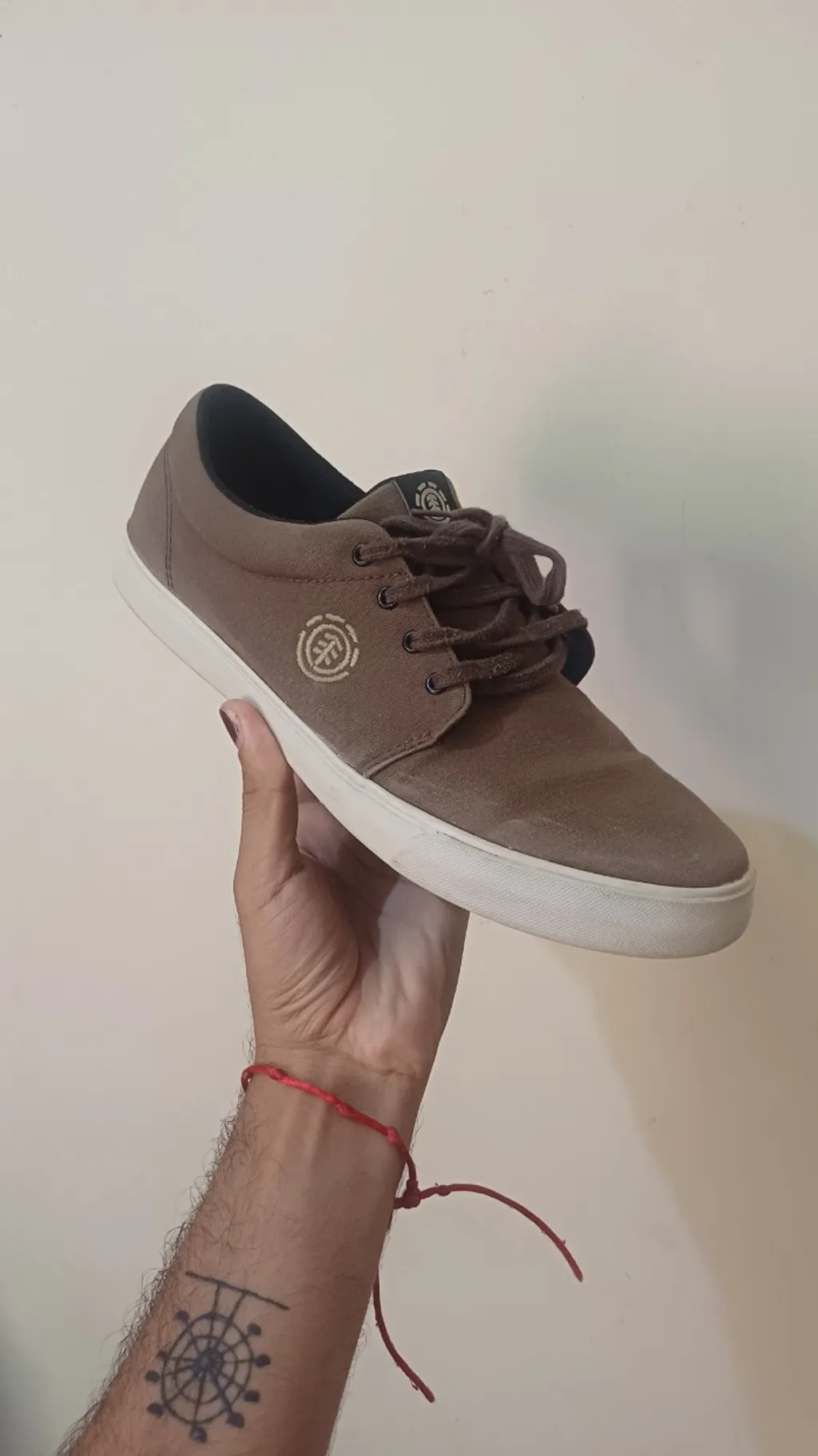 tênis original na cor marrom da marca element. bom estado , solado em excelente estado sem rachaduras ou descolamentos nem rasgos no tênis, possui apenas essas marcas de pasta de dente que não deu tempo de lavar, acredito que ao lavar na maquina deva sair mas não sei, deixei as marcas nas fotos mas a última foto mostra mais. medidas tamanho 42