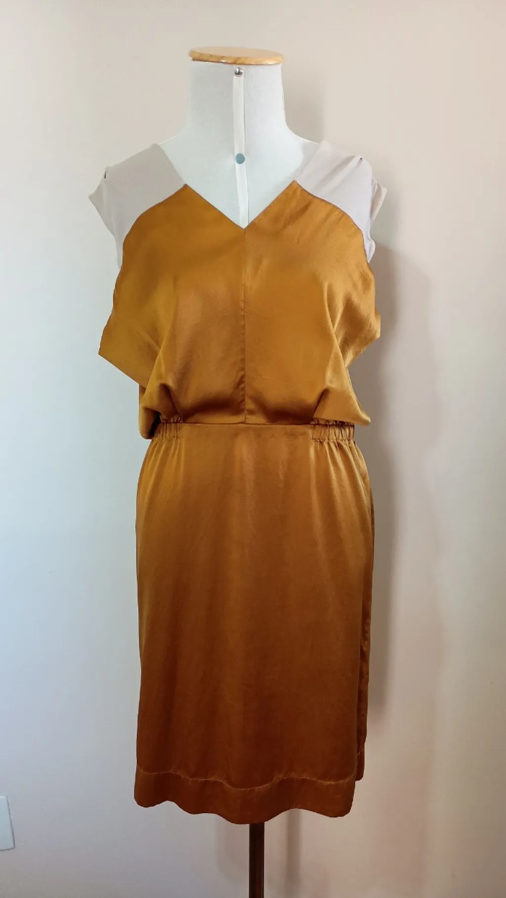 vestido 100% seda na cor ouro, tamanho 38, marca Huis Clos. tem 98 cm de comprimento, 102 cm de busto, a cintura estica até 88 cm e tem 96 cm de quadril.