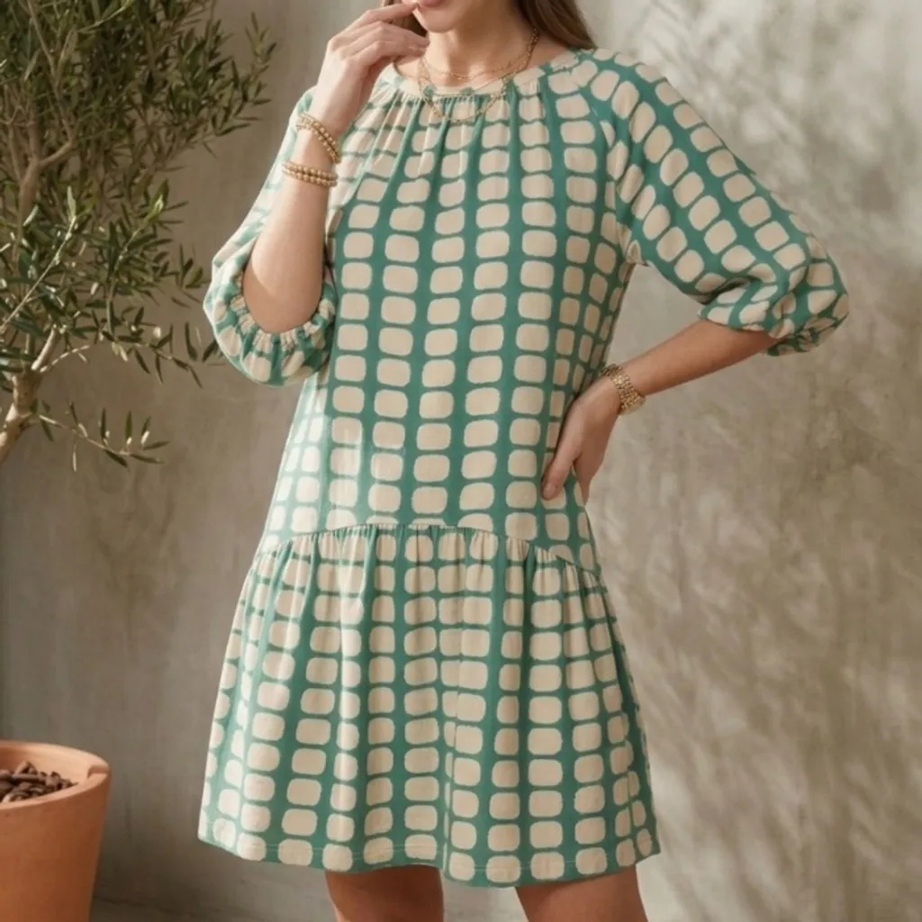 Vestido Animale 100% algodão, modelo curto e soltinho cor verde água e creme com estampa geométrica. Possui manga raglan bufante 3/4 com elástico. P na etiqueta mas veste do P ao G (amplo) / Condição 9/10 104cm circunferência, 38cm manga e 79cm comprimento.