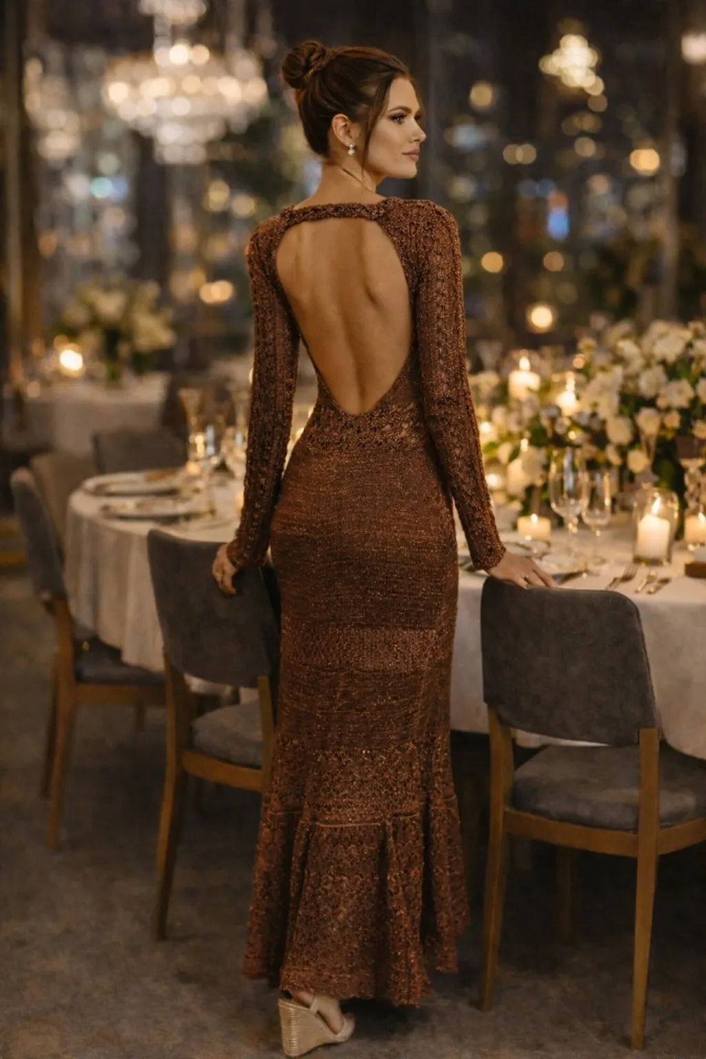 Vestido animale longo em tricô bronze com brilho sutil, modelagem elegante que valoriza a silhueta e costas totalmente abertas até a cintura, trazendo charme sofisticado. ideal para jantares finos, eventos noturnos, festas elegantes e celebrações especiais com estilo e presença. está sem etiqueta.