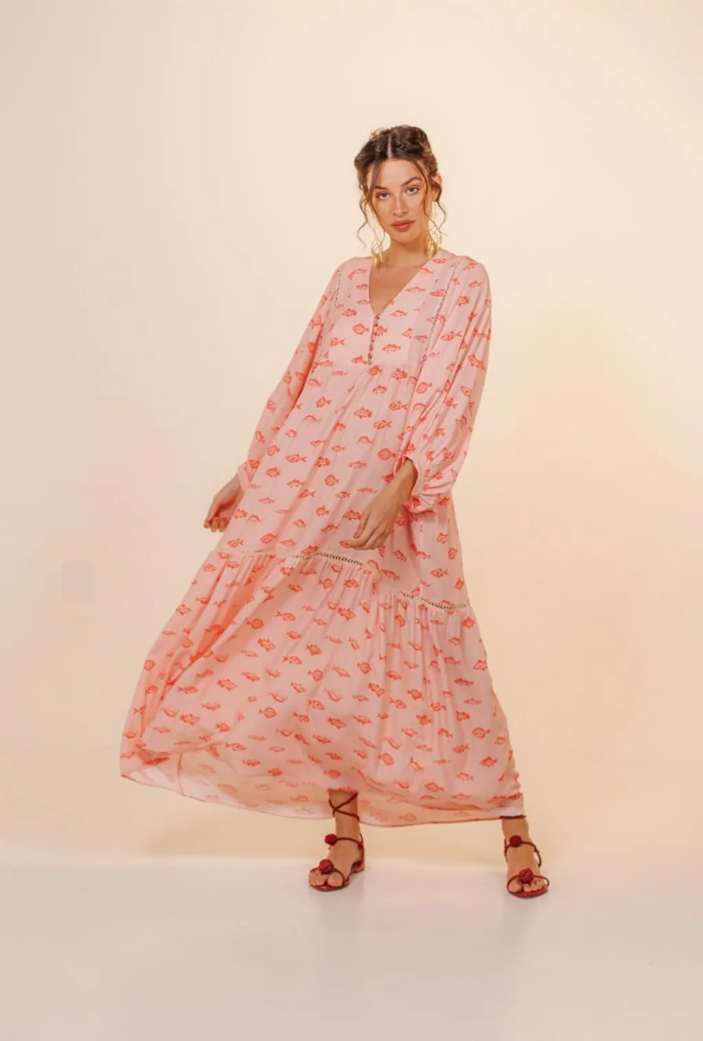 Vestido BOAH, tamanho G, em 100% viscose, com modelagem ampla e fluida, garantindo conforto e movimento. A estampa de peixes em tom sobre tom de rosa traz delicadeza à peça, enquanto o decote em V valoriza o colo. Possui abotoamento no busto com botões de madeira, além de recortes com entremeio em algodão e babado com acabamento em entremeio, que acrescentam charme e sofisticação. ✔️ Usado apenas 1 vez ✔️ Leve, confortável e elegante Perfeito para compor looks frescos e cheios de personalidade.