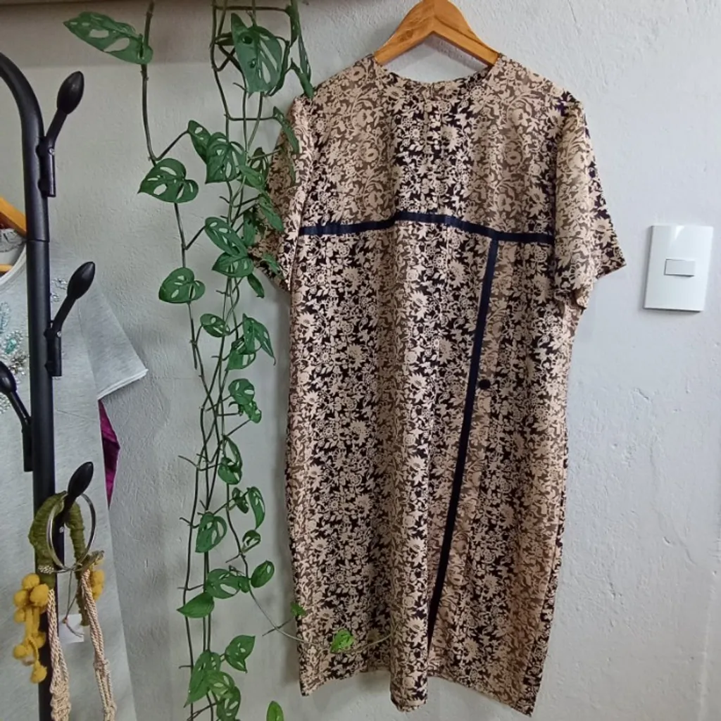 Vestido feito à mão em tecido levinho que não amassa, com estampa clássica e vibe retrô chique. modelagem soltinha, elegante e confortável, perfeita para quem gosta de peças atemporais com personalidade. Funciona bem do casual ao arrumado. Medidas: largura 60 cm | comprimento 100 cm.
