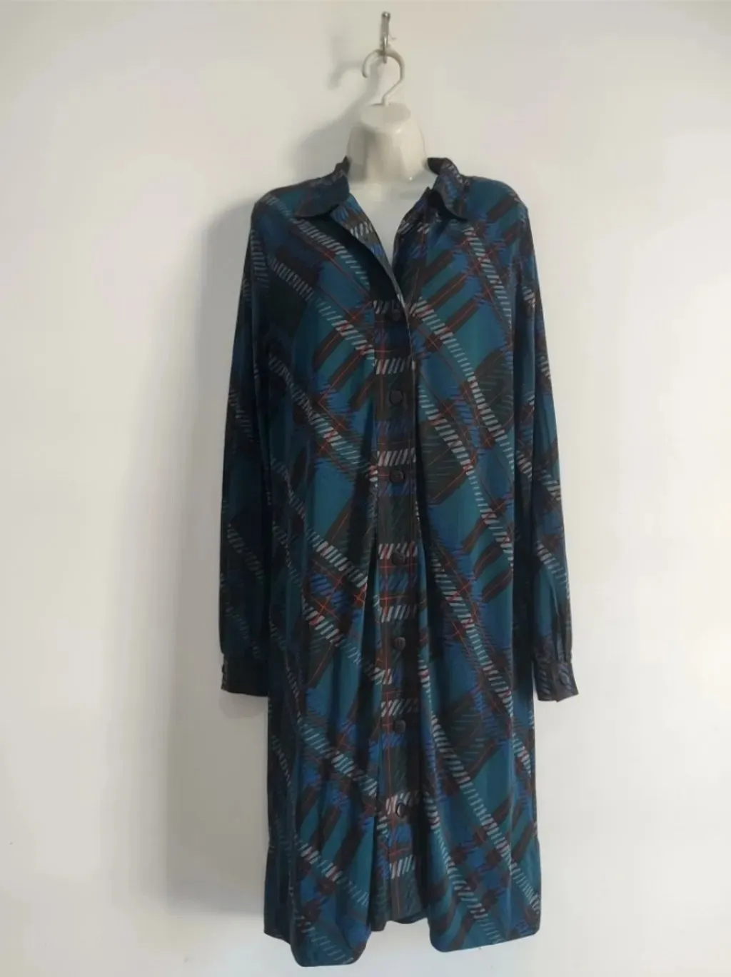 CONFIRA AS MEDIDAS ABAIXO: Possui gola clássica, decote v, manga longa, fechamento com botões frontais e estampa xadrez. Usado, porém em excelente estado de conservação. Tamanho: G Tecido: Acetato e Poliamida Marca: Vigotex Condição da peça: 10/10 Medidas: Busto: 108cm Cintura: 102cm Quadril: 114cm Comprimento: 104cm Comprimento manga: 68cm